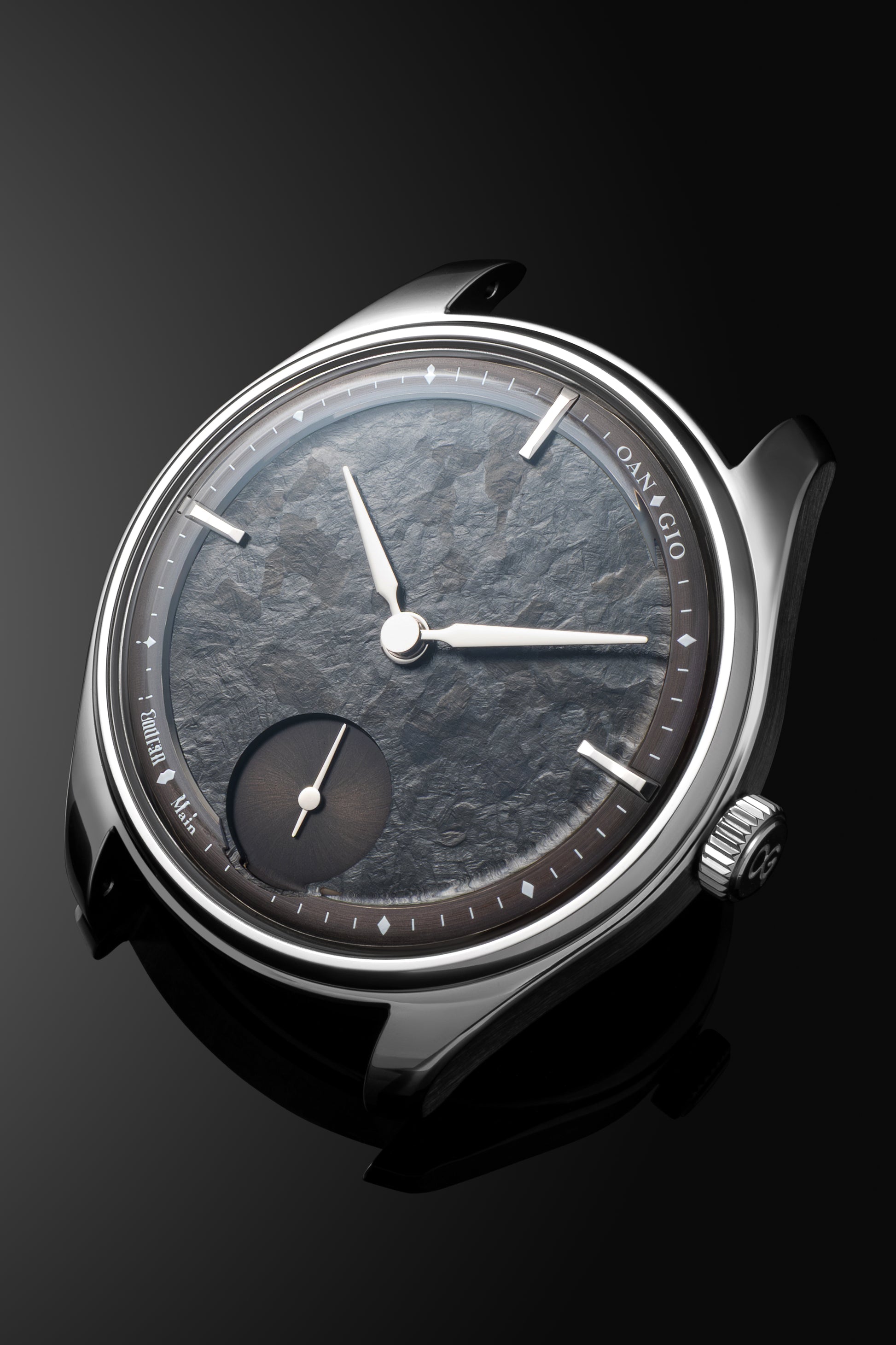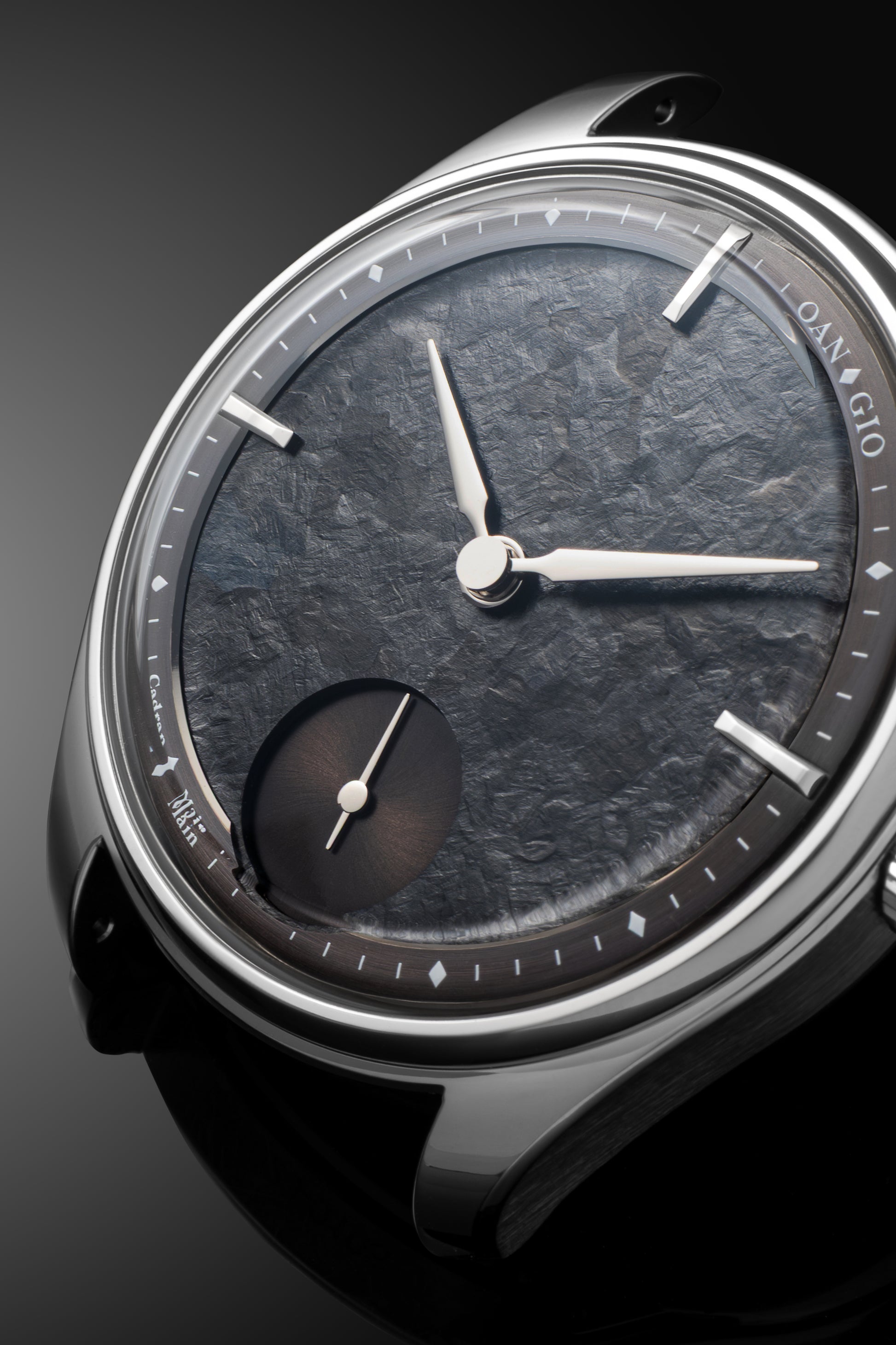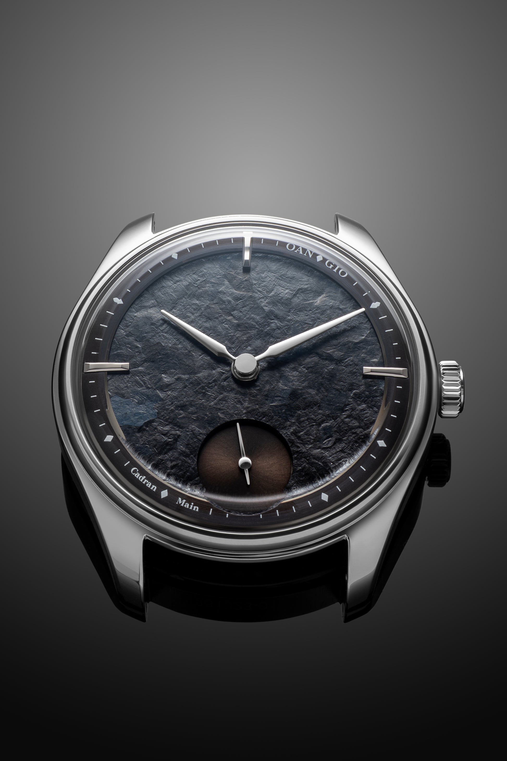 This project is particularly special—it marks the first time we've used an oxidized titanium dial. The surface reveals a spectrum of deep blue particles that shimmer subtly depending on the light and viewing angle. We envisioned a dark, monochromatic aesthetic reminiscent of the mood in the Batman films, which inspired the name of this model: “Gotham.”