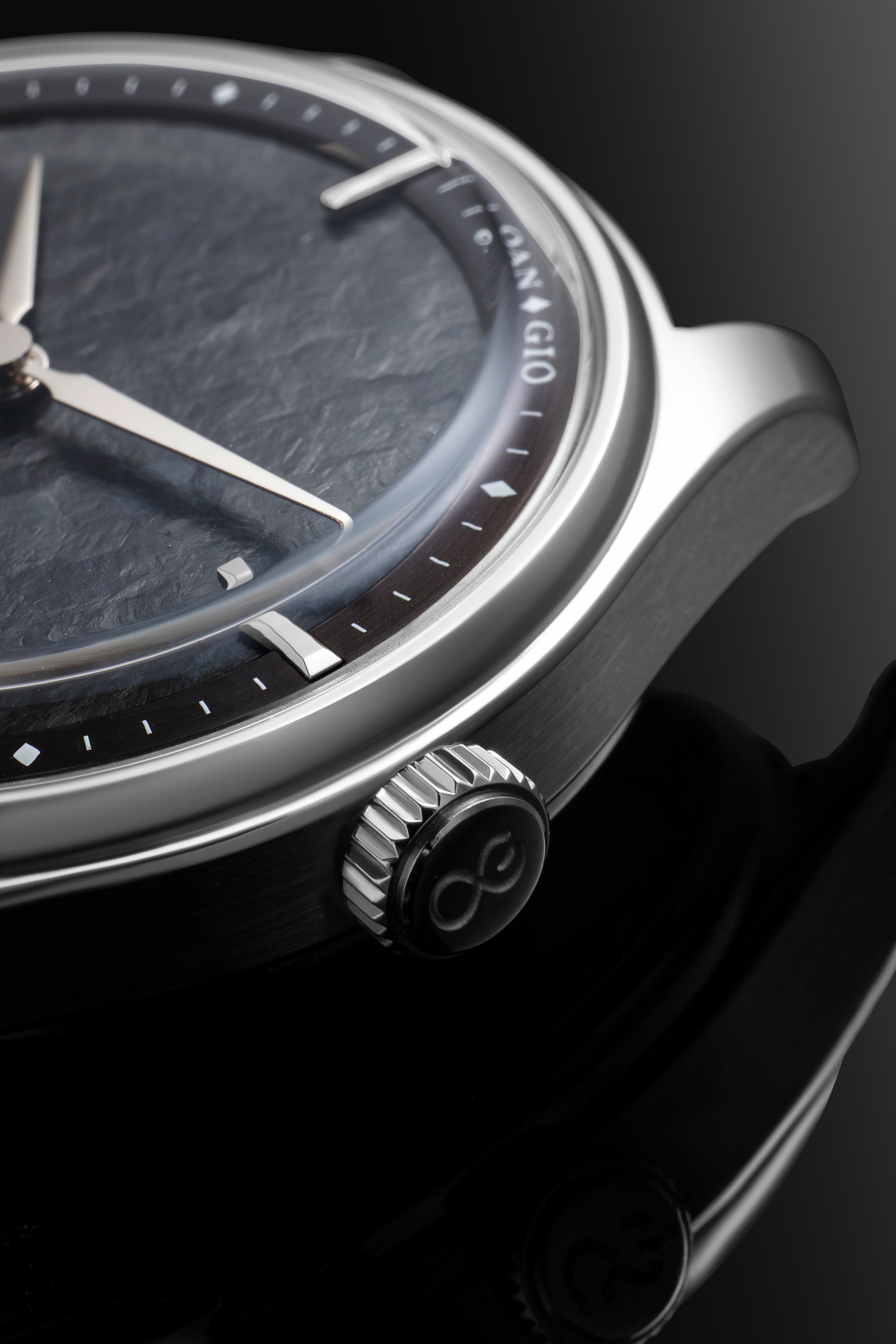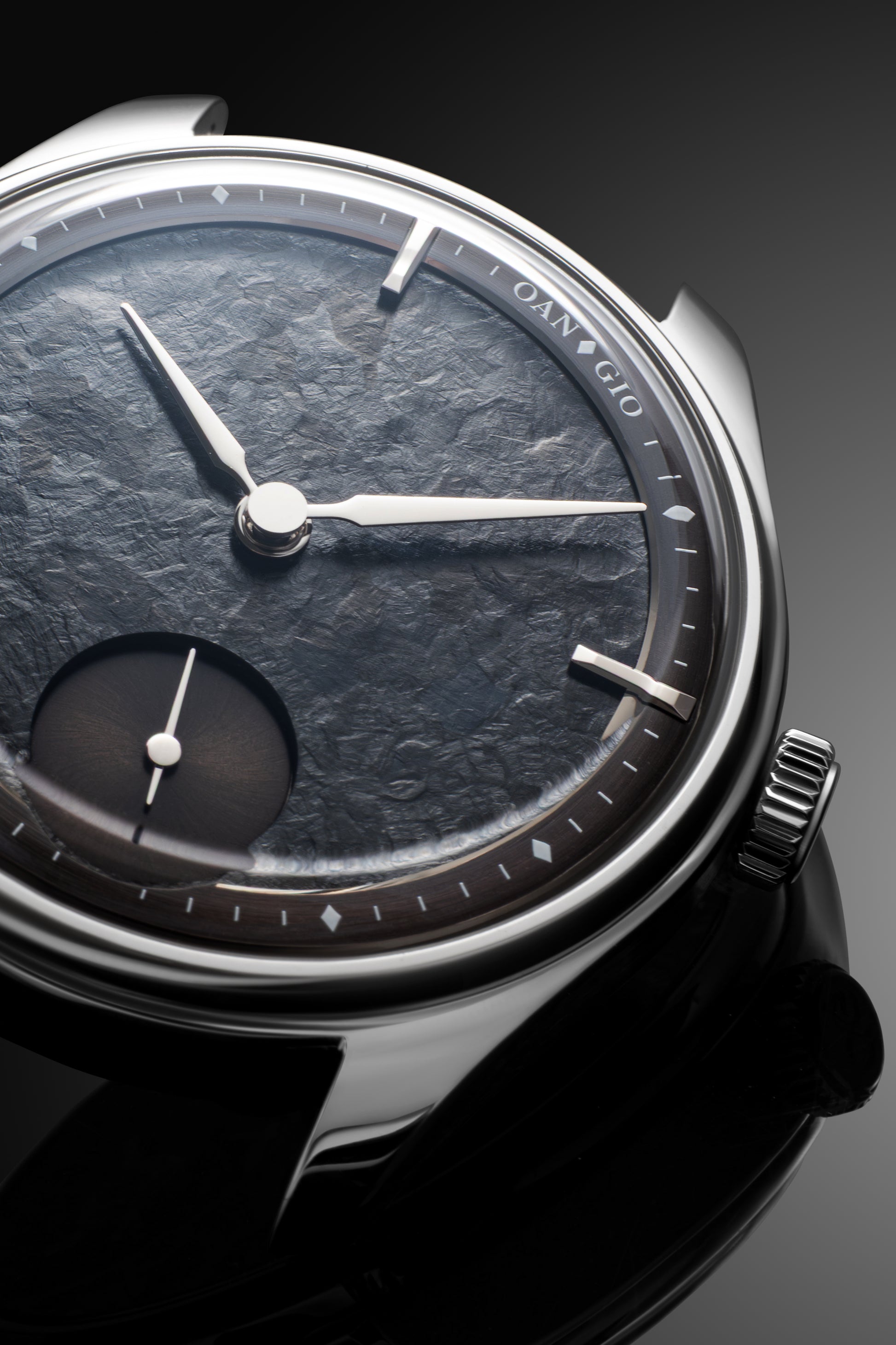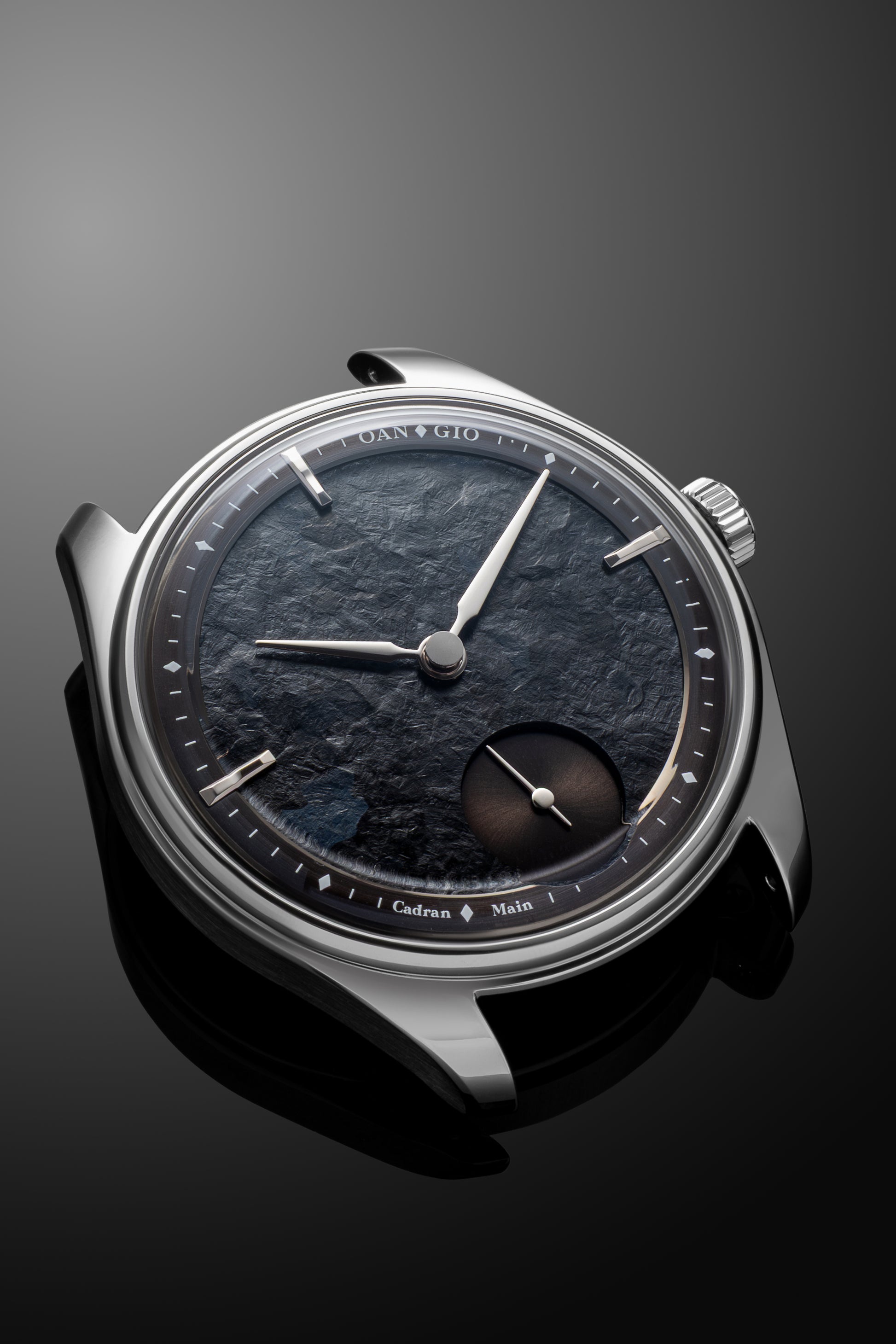 This project is particularly special—it marks the first time we've used an oxidized titanium dial. The surface reveals a spectrum of deep blue particles that shimmer subtly depending on the light and viewing angle. We envisioned a dark, monochromatic aesthetic reminiscent of the mood in the Batman films, which inspired the name of this model: “Gotham.”